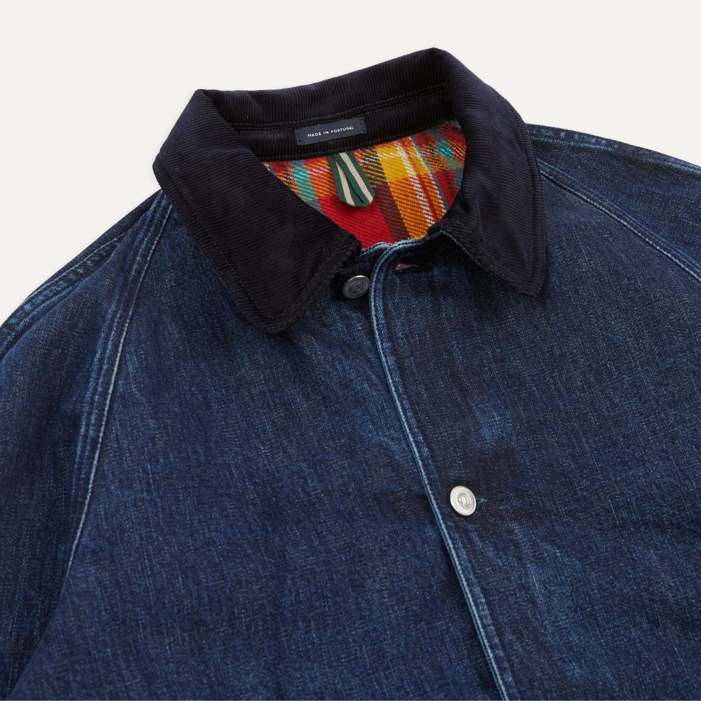 A corduroy collar, check cotton lining and raglan shoulders evoke the jacket’s country sporting inspirations, while a stone wash and contemporary cut make it the type of outerwear that feels as familiar as an old friend and functions equally as well, whether you’re stalking through the undergrowth or standing on the underground.