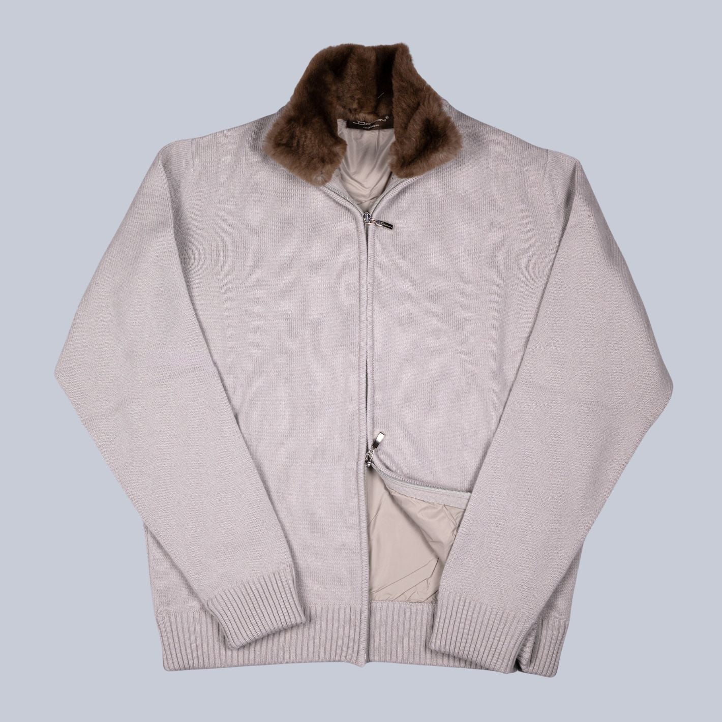 Oatmeal Wool Cashmere Fur Collar Zip Cardigan